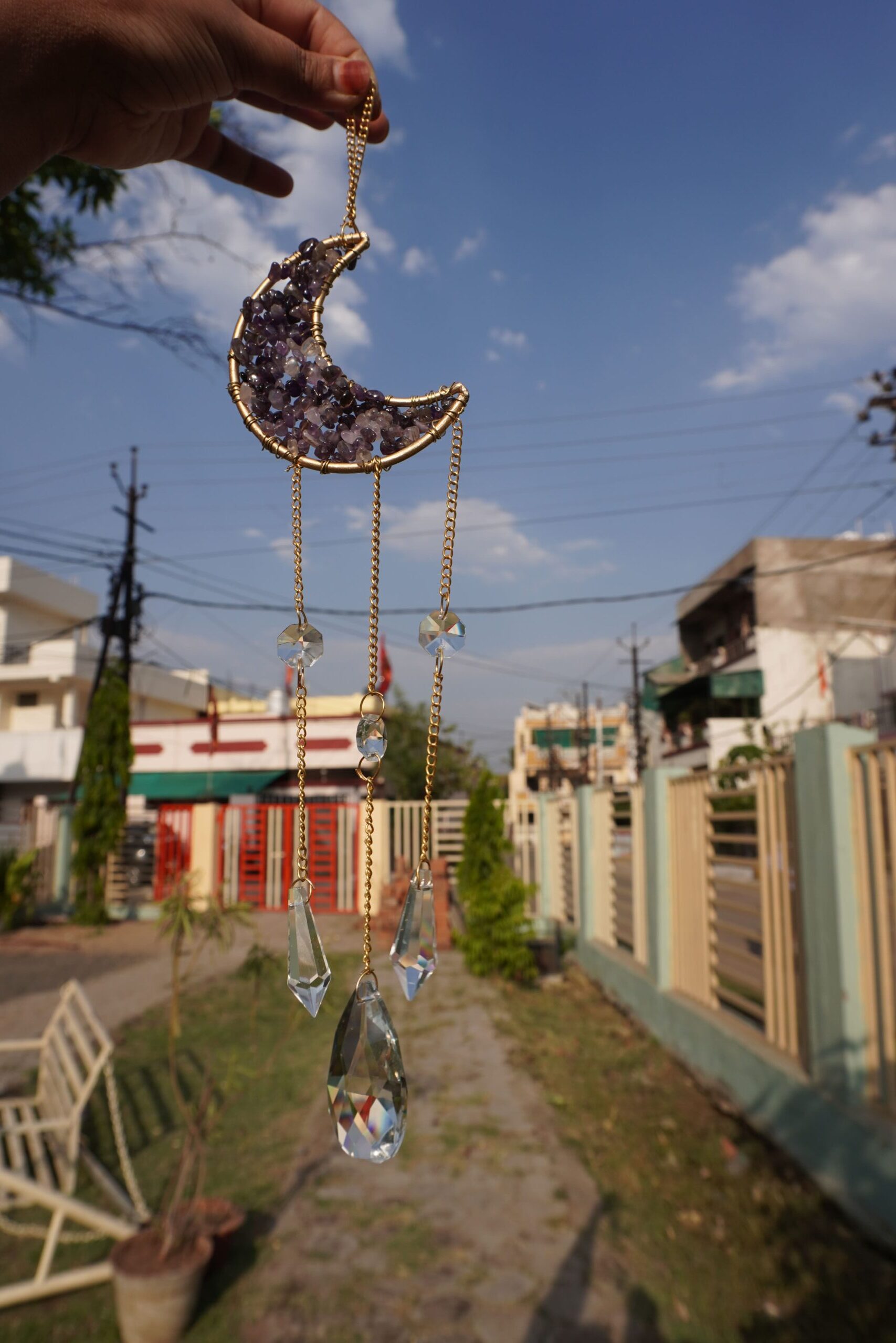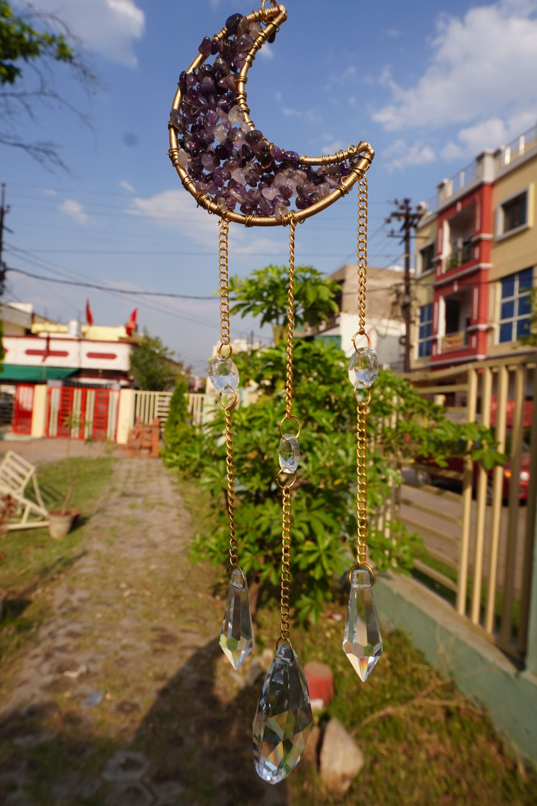 Handcrafted Crystal Moon Dreamcatcher Wall Hanging with Amethyst Stones & Glass Drops