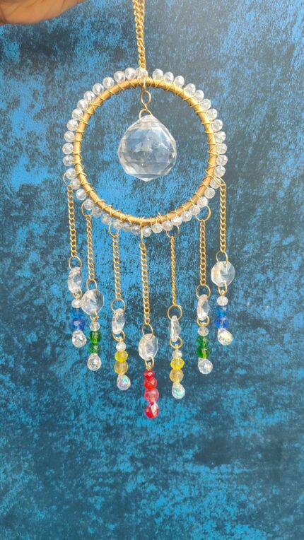 Handcrafted Crystal Suncatcher Ring Hanging with Multicolor Beads & Glass Prism Drops